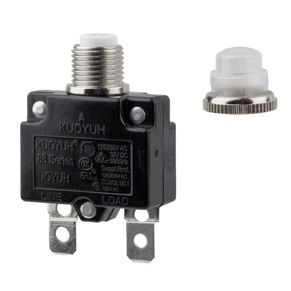 Automata hőbiztosíték. Túlterhelés esetén az áram megszakításához használt, "kipattanó" bimetál biztosíték. Lekapcsolása után kézi nyomással egyszerűen visszaállítható az áramellátás. Védősapkával együtt szállítjuk.